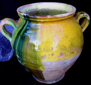 This is a stunning representation of a 19thC Pot a Confit at 10 inches withthick yellow glaze and a cavalcade of green drips to the side in every hue of emerald. A true beauty for the Confit Pot Collector. The form is a classic early 19thC form of Meynes, Gard