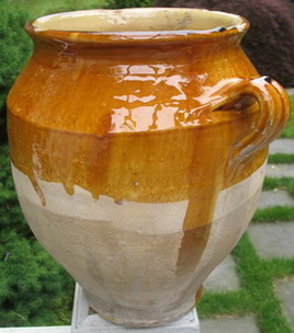 This is an exceptional poterie of this popular genre. This rare form, more narrow and tapered, is a classic example of a Confit at the height of production in Castelnaudary and the Grand Confit Pots. To find one in perfect condition makes this Poterie an amazing example of the finest of Confit Pots that only time,sun and nature could produce and can still be found here...at 'Jaunes et Vertes'. The glaze is probably the prettiest hue of mustard-strong yellow that we have found in a long time. Thick and translucent. Poterie.The bleached white terre cuite is gorgeous. Sitting at 13 inches!