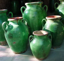 The Tornac jar is one that is considered a masterpiece by most experts of Terres Anciennes being the only storage and transportation jar to have magnificent detailed handles (anses) and the stunning uniformed glaze of the deep aquamarine green. Used for Olive oil storage in barns or for travel on boats, the piece was made with a lovely detailed look that belied its hardy strength to withstand time, daily use and the elements. It is also one of the more elusive antique jars to find in France today. There are probably more Tornacs in homes of Collectors than there are available in all France thus making this lot at 'J&V' probably the largest collection on record. As to the name of the jar, Tornac is a village within the town limits of Anduze in Languedoc. A town known well for their own Poterie ateliers. The sizes of these jars range from 12 inches to 30 inches and each piece is a remarkable remnant of the past. Jaunes et Vertes represents this finest private collection of Terres Vernissées from France owned by JC Mocellin of Paris. Because of our expertise at J&V, M. Mocellin felt most comfortable with our art dealership that is dedicated only to the history of this antique art form.