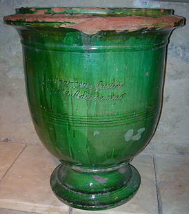 Can it get any better? A signed jar by the Master Potter of Anduze from the end of the 18thC unto the beginning of the 19thC. The year included and also 'made in Anduze'. Incroyable. Jean Gauthier is the famed head of the Gauthier Family that started working at Anduze during the 18thC. The date signed on the jar is '1806'. Talk about provenance! It is a stunning Anduze jar that is a rare form that was based on the Medici forms in Italy. There are many copies made from the last 20 years because the form is so popular. To find a true piece which is about authentic, in proof as it gets, is truly unreal. 'Jaunes et Vertes' keeps raising the bar of excellence...it can't get much better than this piece. 21 inches , stunning green glaze and wonderful condition for a Grand Jar made in 1806!