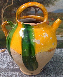 The Beaucaire cruche established the form that was to be used throughout the 19thC. These vessels used daily were for water at the table or throughout the house. This Cruche is from a private collection from our February trip to France. This museum quality 14.5 inch Mustard with green drips Cruche of the region neighboring Languedoc, The Tarn is incredibly rare. The size, the age and the green drips add up to one exemplary Tarn Cruche. It is very rare to find such a beautifully preserved Cruche with a glaze mixture like this from this region with elements of the Beaucaire cruche as well as Cruches of the Sud-Ouest. It has large flames and drips and it has an amazing air of 200+ years of time and use and yet..it has survived in beautiful condition .