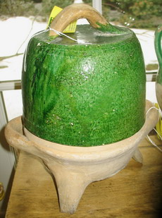 Another rare StOnge found and again, another of the 'high-light' poteries that saintOnge is known for. The late 18thC form and glaze design is one piece that is absolutely not found anywhere else except here at J&V. It almost landed in the 'Musee de Poteries' at St Emillion! It is a Chauferette (used for keeping feet and legs warm during winter) in an unusual design with two primitve marvelous handles and best...a 9 inch lid that covers the complete top half of the piece. The whole lid is glazed and as is all classic stOnge Chauferettes..the interior of the bottom piece. It sits at 14 inches, on three feet and the glaze, form and condition are merveilleuse. Truly a rare and stunning piece. The same exact version can be found in the 'Musee des Poteries' in St. Emilion, Bordeaux.