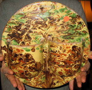 The Porte-Couvertes is a rare piece that was made predominately in the famous Poterie-ville of Cliousclat,Provence. This amazing hanging Poterie was used as a place to store cutlery after washing as it had several holes at the bottom of each 'Porte' (pouch) to drain water. As most Provencal Kitchen pieces, it was made to hang on the wall, keeping it safe from night-time visitors. Very few are left that are not in the Museum at Cliousclat or a Collector's home. This piece stands 14 inches across. (approximate..could be larger) and is in superb condition. The stunning Jaspe glaze with detail of Cliousclat aged by time and the elements is beyond description. This specific perfect circular piece in this rare Jaspe was one of the few selected pieces to be used in the 'Exposition of the Year, 1997: Porte-Couvertes et Port-Cuilliers de Cliouslcat. It is true that this Porte-Couvertes designed as such is one of the most difficult forms to find in France and there are absolutely none of these rare gems in this style available in the States.