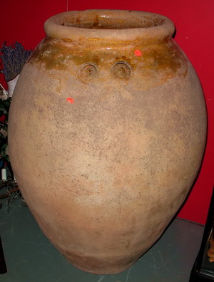 A Jarre de Biot that belongs in the Louvre. Dating from the 16thC, this giant Oil jar made in the famous hill-town of Biot which overlooks Nice and the sea, has the stamps of the 'Croix de Malta" (Cross of Malta), a stamp mark dating from the 16thC when these giant vessels were used to transport Olive Oil for trade throughout the Mediterranean basin. The jar itself, is photographed in the book 'Jarres de Biot'. It stands at 4.5 feet and almost as wide. It is magnificent and most definitely the only Biot Jar of this age and this other form of this ancient time in the United States.