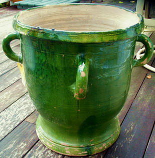These classic planters du Midi came in sizes ranging from 8 to 26 inches and were made with these classic handles only found on these 19thC Vases (jardinieres). These pieces became a favorite of the Mayor of Toulouse during the 1840s and he ordered hundreds for lining the Boulevards. For a time, they were called 'Jardinières Touloussiennes' , as most of the planters could only be found in Toulouse. The true source was a famous atelier in Castelnaudary. This beautiful Version here is the very rare early 19thC 4 handle, standing at 21 inches and has one of the finest quality emerald green glazes that I have found in over 2 years. To find these in this size in the US (with the cost of shipping) is sky high in price and most are 20thC passing as 19thc. This one here is early-19thc, sans doute, and just coveted for the rare giant 4 handles. It is truly the zenith of all Toulousiennes de Castelnaudary. Great condition for these poteries anciennes that spent half of their life standing along the city streets of 19thc Toulouse. These planters are stunning throughout the house and in the right climate, on a deck growing a small lemon tree!Personally...I leave them to show on their own
