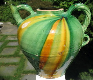 A Giant 'museum quality' Tarn Cruche in Green with yellow drips and Braided Handles This poterie is one of the most coveted and hardest to find by collectors and added to that, it is possibly one of the finest nad most beautiful ever made in green in this form.Only 'Jaunes et Vertes' could find this piece that is only in private collections in France~! Stunning handles , incredible size at 14 inches, glaze only seen in museums with stunning form and condition. A museum piece, Tout A Fait!