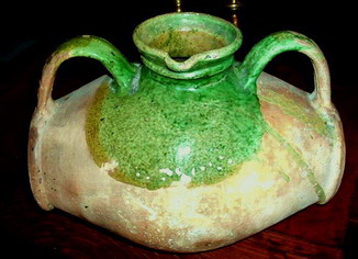 The Tonneau is another of the 'high-light' poterie that saintOnge is known for. This exact form is not found anywhere else throughout France. The early 19thC bib glaze design, the perfect form made exact so the potier could roll the piece forward and pour vinegar without spilling a drop. Truly a rare and stunning piece. The same exact version can be found in the 'Musee des Poteries' in St. Emilion, Bordeaux. 15 inches in lenght and 8 inches in ht. Only for a serious collector. One of the last Tonneaus to be found in this rare form. Au fait, JV has only found 3 since 2002. One is in our private collection. .