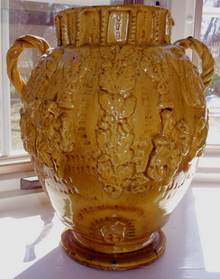 This is a one of a kind Fountain that was made 'sur mesure' for someone with some means. The detail work is amazing with the relief extending out almost up to 1/2 an inch. The Fountain was a marriage present. As bacchus dances in the center, there are four couples in an embrace and kiss. Flowers, vines and leaves and other merry figures above the kissing couples. Truly a work of art that transcends all forms of brilliant 'Art Populaire Francais'. The mustard glaze is thick and in perfect condition and the handles are braided. Just Under 14 inches. This has been in the 'J&V' collection for a number of years.