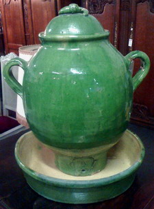 This is a one of a kind primitive Fountain intaxt with all pieces! Only once before has that happened in all our years. It has the stunning 20 inch body with a detailed mans face added where the spout allowed the water to exit. The original Lid and ...the Bassin that went below to catch the water as this piece was meant to hang in the wall. The style added to hang the piece to the wall shows classic early 19thC work but...I'll say 1820-1850. The glaze is a beautiful clear green-emerald green and it was , with out doubt, amde in the L'Heralut in Pezenas or perhaps St jean de Fos. It is an extraoridnary piece and was obviously a marriage present.