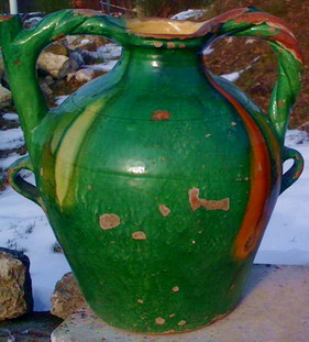 A Giant 'museum quality' Lauragais Cruche in stunning Green with drips of yellow, Braided handles (anses torsades) and not a third handle...but four! The rarest of the rare! The size is also quite amazing at 18 inches. This poterie is one of the most coveted and hardest to find by collectors 'in the know'..in France...and to find one in green with all these bells and whistles...???...only 'Jaunes et Vertes'~! Stunning handles , incredible size at 18 inches, green glaze only seen in museums and amazing drips and flames, stunning form and condition. A museum piece, Tout A Fait!