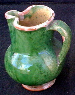 The Pichet de Provence is the rarest pitcher form to be found in this region as it was only made in a sliver of the area between Salernes in the Var and Aubagne near Marseilles. The pichet was used daily for drinking cider and would sometimes be put to use as a wine pitcher, en plus! The pinched bec with the large circular rim coated in a cream glaze was considered a feat of creativity when the Potieres of the mid-19thC were continually coming up with new creations to keep 'au courrant'. This popular form was a keeper in Provence! They ranged from 7 to 15 inches and were glazed in a stunning brick-red glaze as well as some rare glazes in green and pale yellow. To J&V has retrieved some more of these pichets from a collector who lives near Salernes and they are exemplary. This one we present here is from a lot with the rare distinction of having the older form which had a bulbous center that is more pronounced than other pichets of the early-mid 19thC A beautiful examples of this form at the rare smaller size of 7 inches in TOP condition and the one of the oldest that J&V has ever found with a 'beyond emerald' green that covers the entire pichet! This was only made 'sur mesure' (to order) It has the perfect combination of a wonderful authentic air of use and time and terrfic condition! Not found very often in the U.S. nor Provence....their numbers are sadly fading at known antique centers..as collectors keep them locked up in their armoires.