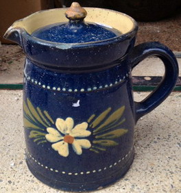 A rare Milk Pitcher of Alsace in a very early traditional design motiff of the Mid 19thC. Well used and yet in terrific condition. Rare stunning cobalt blue glaze with original lid. 7 inches.