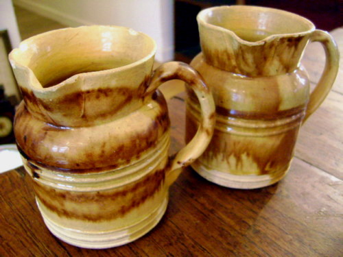 The Cliousclat Pot a Lait embodies all that we love about the true utilitarian pieces of Art Populaire. Made to be used daily but with a touch of color and form. These pots (really pichets) were used to warm milk by the fire (thus the handles held away from the fire) each morning for the families breakfast. The size of the Pot A Lait depended on how many people 'la mere' was prepaping for..thus a service of sizes were made. We have two of the sizes in descending order at 7',5.5'and 4'. They are amazing in their jaspe glaze of, Jaunes (yellow), caramels, bruns et cremes. The base Yellow-ware glaze has a patina that only time could produce and the vibrant design makes this a seemingly simple yet magnificent Art populaire piece of Provence.