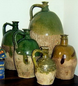 These bottles for storing oil, called 'SaintOnge Bottles' or 'Bouteilles de saintOnge, could be found throughout areas of Aquitaine along the coast. Perhaps this influenced this unique green that is almost an unearthly aquamarine glaze color. I've always found the poteries de saintOnge to have a sense of mystery as after all, this small area was not far from the land that Merlin and the Knights of the Roundtable roamed. Thus it would be fitting for these pieces all to have a special 'Je ne sais quoi?'. The form is close to a long narrow tubular shape that opens as it reaches the top near the handle and spout, a primitive shape like the plongeon. It was used for centuries to store oil not only from weather and the elements and vermin...but also the effects of the sea. The Bouteilles are not found in the U.S. very often but when they are, it is usually a singular stray. It was to my surprise, in going to France in 1990, that I learned of the different sizes and how many people of the region had kept them in sets. En fait, there were 5 sizes ranging from 7 - 24 inches with the largest size only made on demand and the smallest, often vicitm to the passage of time. Jaunes et Vertes,at present, has four of the 5 sizes available. We have assembled many sets of 3, 4 and even one set of 5 for many private clients. The look is breathtaking.