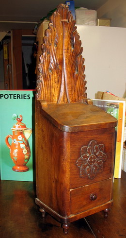 All pieces for the Provencal kitchen were made to hang on the wall. Conditions during the 19thC warranted a safe area to guard edible ingredients during the night..thus..the wall. The Boite a sel in its classic form was a long thin form with legs and a lid on top for Salt storage in the box. Below, there was a small drawer where one would keep there official tax permit. Oui! Salt was a luxury that was heavily taxed during this period. The piece that I propose you is one of the most beautiful and was certainly made to order for a family of means. The engraved, detailed backing is one-of-a-kind . Wood is in a classic Provencal Noyer (Walnut). Perfect condition. Possibly one of the rarest Salt Boxes available in the States.