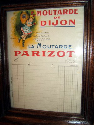 This wonderful piece of French Publicity dates back to the end of the 19thC. Moutarde Parizot was and is one the best Mustards to come out of Dijon. This piece is an order form made with the lithographic process of the time that was quite sophisitcated in its results. At this time, many famous Artists were being hired to do large Publicity posters for travel and products and even Fans and Signs advertising products. This is the first time we have found such a rare piece in this specific sub-genre. An order form for Parizot Mustard with the lithographic work of the artist added to the form. These forms were sent as gifts at Christmas from Parizot to all the large and small Shops that carried their products. It was found already framed and is just a perfect small piece of French Publicity to hang in the kitchen! With Frame: 10 inches in height. 8 inches in width.