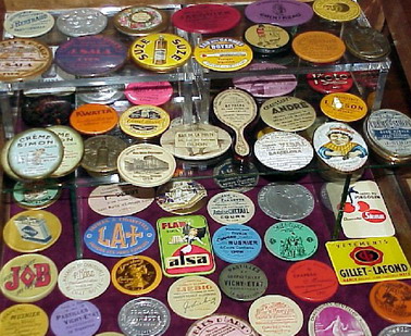These highly collectible 'petits mignons' in l'histoire de French Publicity were basically scooped up during the late 90s when 'Art Publicity' became incredibly coveted in France. Luckily, J&V has always thought that the Publicity items such as these pochet mirors and others (Fans, Posters in Tole, Maitres de l'Affiche) enhance our genre of poteries, parfait! These pocket mirors were made by companies to send to their client-stores who in turn gave them out to their best customers. As you can see from the photo, between two of the collectors here at J&V, we have the largest selection in the U.S. En fait, some of these 'miroirs de poche' we have 'en doubles!' You can write if you'd like to see groups of the mirors perhaps by a type of product (wines, food companies, everyday products of these bygone decades) or style.