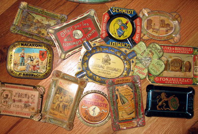 These highly collectible 'petits mignons' in l'histoire de French Publicity were basically scooped up during the late 90s when 'Art Publicity' became incredibly coveted in France. Luckily, J&V has always thought that the Publicity items such as these vide-poches (shallow bowl or object) and others (Fans, Posters in Tole, Maitres de l'Affiche) enhance our genre of poteries, parfait! These vide-poches were made by companies to send to their client-stores who in turn out them out on the Comptoirs of the bistros (for leaving a tip) or used for change in small businesses. During the 20thC some people used them for cigarettes before they were 'discovered' as a valuable piece of Art Populaire Publicity/. As you can see from the photo, between two of the collectors here at J&V, we have the largest selection in the U.S. En fait, some of these 'Vides Poches' we have 'en doubles!' You can write if you'd like to see groups of the Vide-Poches perhaps by a type of product (wines, food companies, everyday products of these bygone decades) or style that you can see here.